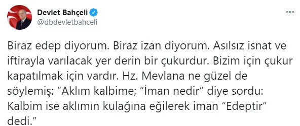 Biraz edep diyorum. Biraz izan diyorum. Asılsız isnat ve iftirayla varılacak yer derin bir çukurdur. Bizim için çukur kapatılmak için vardır. Hz. Mevlana ne güzel de söylemiş: “Aklım kalbime; “İman nedir” diye sordu: Kalbim ise aklımın kulağına eğilerek iman “Edeptir” dedi.
