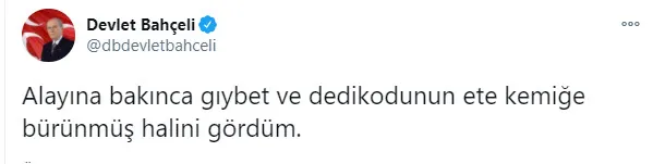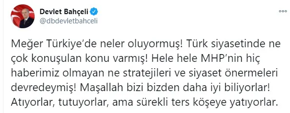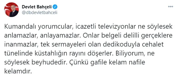 Milliyetçi Hareket Partisi Genel Başkanı Devlet Bahçeli, Twitter hesabından yaptığı açıklamada televizyon kanallarında yorumculuk yapan isimlere ve Halk TV, Habertürk ve KRT gibi televizyon kanallarına tepki gösterdi. Kendine has üslubuyla paylaşım yapan Bahçeli Cumhur İttifakı’nın devam edeceği mesajıyla HDP’nin kapatılması mesajını da yineledi.