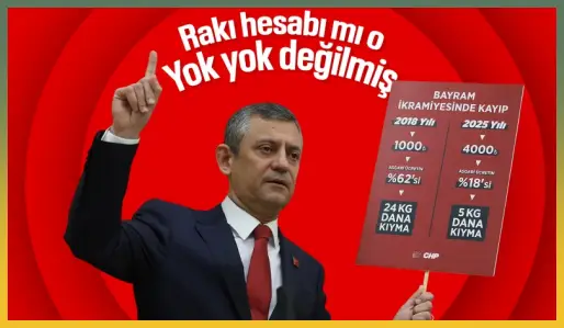 Daha önce TBMM kürsüsünden rakı hesabı yapan CHP Genel Başkanı Özgür Özel, bu kez bayram ikramiyeleriyle emeklilerin ne kadar kıyma alabildiğini hesapladı. Özel, 2018’de verilen ikramiye ile 24 kilo et alındığını söylerken “Şimdi 4 kilo alınabiliyor” dedi.