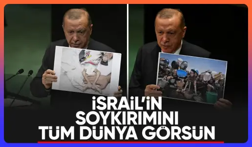 İşte sizlere bir başka fotoğraf daha. Şimdi size soruyorum, elimdeki şu fotoğrafın güvenlik arayışıyla ne ilgisi var? Bunun adı canlıya düşmanlık, hayata düşmanlık değil midir? Bu kürsüden açık açık ifade ediyorum. Gazze’de bir savaş yoktur. Gazze’de iki taraftan söz edilemez. Gazze’de bir yanda elinde en modern, en öldürücü silahlar olan düzenli ordu.