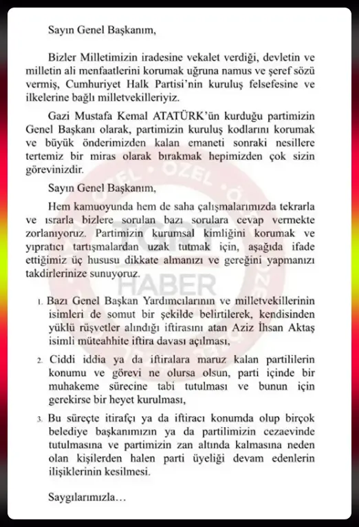 “Gazi Mustafa Kemal Atatürk’ün kurduğu bu partinin temiz bir miras olarak geleceğe taşınması hepimizin sorumluluğudur. Ancak sahada ve kamuoyunda bize yöneltilen sorular karşısında zorlanıyoruz. Partiyi tartışmaların odağından çıkarmak için bazı adımların atılması zorunludur.”