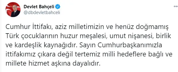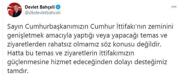Sayın Cumhurbaşkanımızın Cumhur İttifakı’nın zeminini genişletmek amacıyla yaptığı veya yapacağı temas ve ziyaretlerden rahatsız olmamız söz konusu değildir. Hatta bu temas ve ziyaretlerin ittifakımızın güçlenmesine hizmet edeceğinden dolayı desteğimiz tamdır.