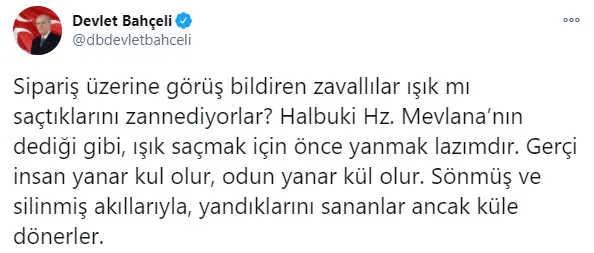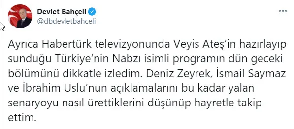 Son dakika: MHP Genel Başkanı Devlet Bahçeli, Twitter’dan yaptığı açıklamada Mustafa Balbay, Veyis Ateş, Deniz Zeyrek, İsmail Saymaz ve İbrahim Uslu’ya “Bu kadar yalan senaryoyu nasıl ürettiklerini düşünüp hayretle takip ettim” sözleriyle tepki gösterdi. Habertürk, Halk TV ve KRT içinse “Onlara bakınca, konuşanların düşüncelerinden ziyade arkalarındaki lekeli zihniyetlerin gerçek niyetleri açığa ve ortaya çıkmaktadır.” ifadelerini kullandı.