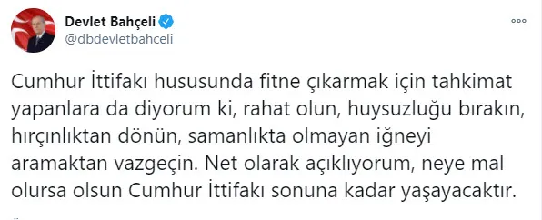 Cumhur İttifakı hususunda fitne çıkarmak için tahkimat yapanlara da diyorum ki, rahat olun, huysuzluğu bırakın, hırçınlıktan dönün, samanlıkta olmayan iğneyi aramaktan vazgeçin. Net olarak açıklıyorum, neye mal olursa olsun Cumhur İttifakı sonuna kadar yaşayacaktır.