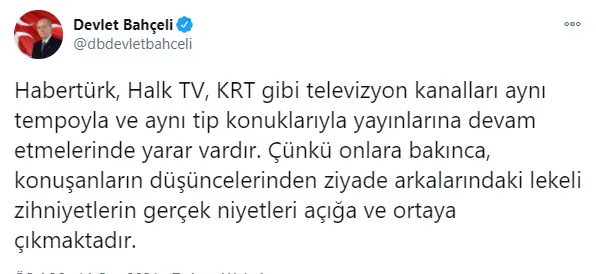 Milliyetçi Hareket Partisi Genel Başkanı Devlet Bahçeli, Twitter hesabından yaptığı açıklamada televizyon kanallarında yorumculuk yapan isimlere ve Halk TV, Habertürk ve KRT gibi televizyon kanallarına tepki gösterdi. Kendine has üslubuyla paylaşım yapan Bahçeli Cumhur İttifakı’nın devam edeceği mesajıyla HDP’nin kapatılması mesajını da yineledi.