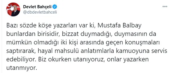 Bazı sözde köşe yazarları var ki, Mustafa Balbay bunlardan birisidir, bizzat duymadığı, duymasının da mümkün olmadığı iki kişi arasında geçen konuşmaları saptırarak, hayal mahsulü anlatımlarla kamuoyuna servis edebiliyor. Biz okurken utanıyoruz, onlar yazarken utanmıyor.