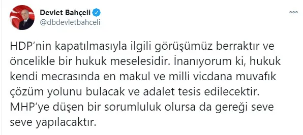 HDP’nin kapatılmasıyla ilgili görüşümüz berraktır ve öncelikle bir hukuk meselesidir. İnanıyorum ki, hukuk kendi mecrasında en makul ve milli vicdana muvafık çözüm yolunu bulacak ve adalet tesis edilecektir. MHP’ye düşen bir sorumluluk olursa da gereği seve seve yapılacaktır.