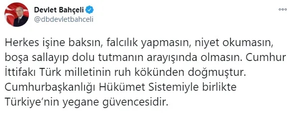 Herkes işine baksın, falcılık yapmasın, niyet okumasın, boşa sallayıp dolu tutmanın arayışında olmasın. Cumhur İttifakı Türk milletinin ruh kökünden doğmuştur. Cumhurbaşkanlığı Hükümet Sistemiyle birlikte Türkiye’nin yegane güvencesidir.