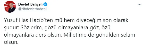 Yusuf Has Hacib’ten mülhem diyeceğim son olarak şudur: Sözlerim, gözü olmayanlara göz, özü olmayanlara ders olsun. Milletime de gönülden selam olsun.”