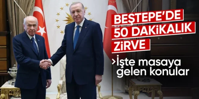 Cumhurbaşkanı Recep Tayyip Erdoğan ile Milliyetçi Hareket Partisi (MHP) Genel Başkanı Devlet Bahçeli, Ankara’da kritik bir görüşmede bir araya geldi. Cumhurbaşkanlığı Külliyesi’nde gerçekleştirilen toplantı, günün en dikkat çeken siyasi gelişmelerinden biri olarak öne çıktı. Saat 17.50’de başlayan görüşmenin yaklaşık 50 dakika sürdüğü ve akşam saatlerinde sona erdiği bildirildi.