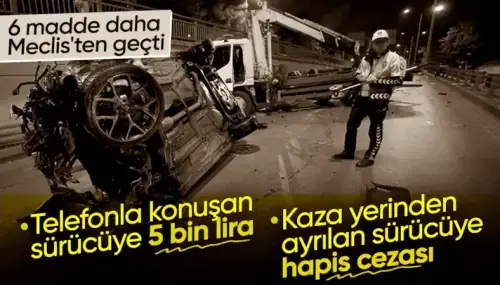 Meclis’te kabul edilen maddelere göre; araçla seyir halindeyken cep telefonu kullanana 5 bin lira, emniyet kemeri kullanmayana 2 bin 500 lira ceza uygulanırken, ölümlü veya yaralanmalı trafik kazalarında olay yerinden ayrılan sürücülere 1 yıldan 3 yıla kadar hapis cezası verilecek.