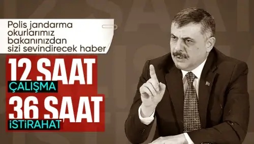 Polislerin özlük haklarındaki iyileştirmelerin Maliye Bakanlığı ve Cumhurbaşkanlığı Strateji Geliştirme Dairesi iş birliği ile yürütüldüğünü anlatan Bakan Çiftçi, 10 bin polis okulu talebesinin Temmuz yerine Mayıs ayında mezun edileceğini, böylece yaz aylarında 12 saat çalışma 36 saat istirahat sistemine geçileceğini müjdeledi.